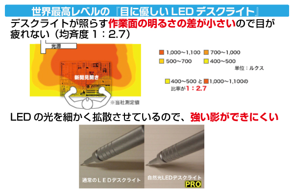 【自然光LEDデスクライトPRO】はこの推奨基準をしのぐ 「均斉度1:2.7」を実現しました!