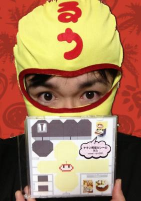 黄色のマスクをかぶって宮崎とチキン南蛮カレーのPR活動をしています。