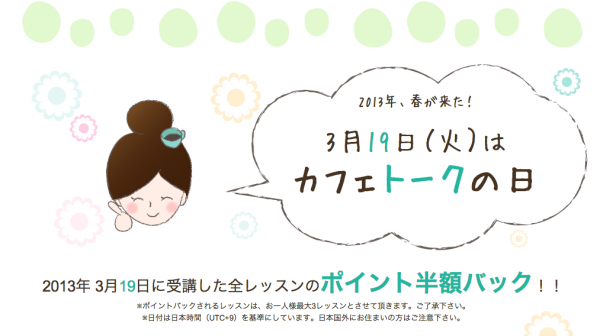 大好評のオンラインレッスンが半額ポイントバックされる「カフェトークの日」が2013年3月も開催されます。