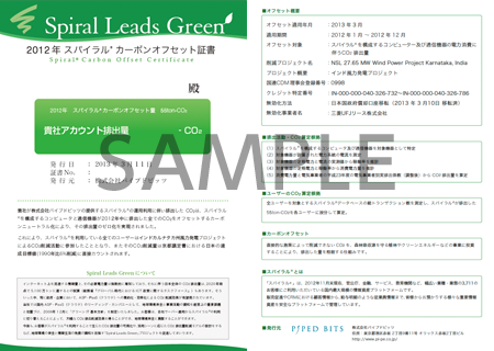 なお、パイプドビッツは、ASP・PaaS(クラウド)「スパイラル(R)」を構成するコンピューターと通信機器が2012年中に排出したCO2全量を2013年3月10日にオフセットし、カーボンニュートラル化しております。オフセット証書にて皆さまにお知らせするCO2排出量は、既にオフセット済みですので、ユーザーの皆さまがあらためてオフセットする必要はございません。