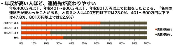 年収400万円以下、年収401~800万円以下、年収801万円以上で比較をしたところ、「名刺の連絡先が変わったことがある」と答えた人は400万円以下では23.0%、401~800万円以下では47.8%、800万円以上では62.9%。全体では「名刺の連絡先が変わったことはない」という人が66.4%。