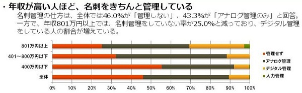 名刺管理の仕方は、全体では46.0%が「管理しない(捨ててしまう・机の中にまとめておくのみ、など)」、43.3%が「アナログ管理のみ」と回答。一方で、年収801万円以上では、名刺管理をしていない率が25.0%と減っており、デジタル管理をしている人の割合が増えている。