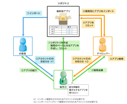 販売元が、「リポジトリ」のオーナーになり、開発者が「開発権限」で「アプリ」を作成、コミットする。販売元は、作成した「アプリ」を販売し、そのお客様は「ユーザー権限」で「スパイラルアプリセンター」からインポートする。