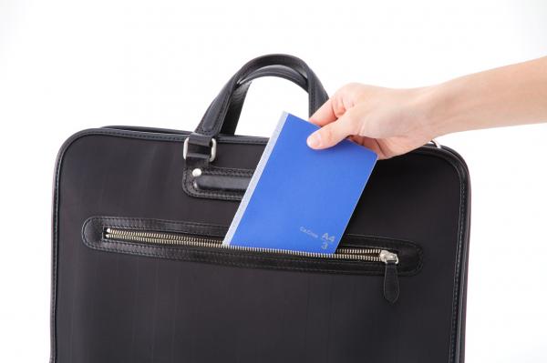 そこでプラスは、「A4×1/3サイズ」(215×105 mm)を「これからのノート」の“新定番”サイズとして提案するに至りました。薄さも4 mmとコンパクトで、ジャケットの内ポケットやハンドバッグに入れても持ち運びやすいうえ、議事録等の長文もしっかり書き込めます。社外でも社内でもメモ帳とノートはこの1冊に集約できます。
