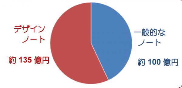 現在のノート市場は約235億円と推定。そのうち、手ごろな価格帯の一般的なノートが約100億円、品質やデザインなど、より嗜好性の高い「デザインノート」が約135億円(自社推定 メーカー出荷ベース)。