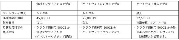 本サービスには、初期費用が不要な仮想アプライアンスモデル、ゲートウェイレンタルモデル、購入モデルがあります。クラウドストレージは全モデル共通で初期容量500GB、1GB追加あたり月額45円でご提供し、今後1年間で20社の導入を目指します。