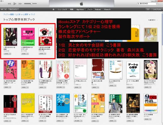 アップルのサービスを提供する株式会社アドベンチャー(本社:東京都渋谷区、代表取締役 中村俊一 http://www.adventure-inc.co.jp/ )は、iBooks電子書籍市場に参入して1週間で、iBooks心理学 カテゴリー独占 1位 2位 3位を3月22日に獲得いたしました。