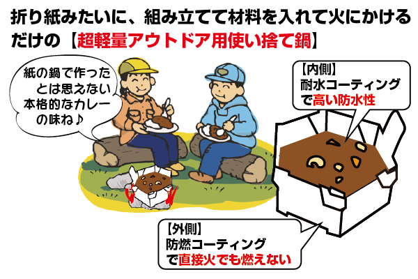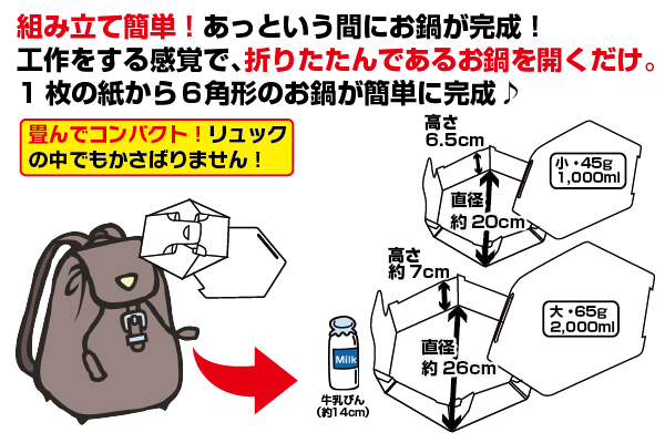 1、「折り畳み式の紙製なべだから、とにかく軽くて(45g~65g)かさばらない。」