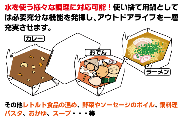 使い捨て用鍋としては必要充分な機能を発揮し、アウトドアライフを一層充実させます。