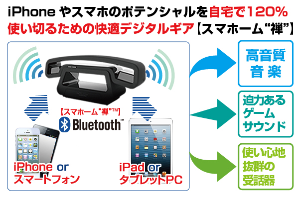 【スマホーム"禅"】 (http://www.sma-home.com/)には、普通の固定電話のように使えるワイヤレスハンディホンが内蔵。このハンドセットは、人間工学的にデザインされており、iPhone/スマホで電話することに比べて、とても快適に長電話が楽しめます。