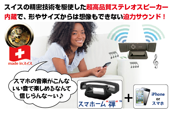 【スマホーム"禅"】 (http://www.sma-home.com/)には、サイズからは想像もできない、超高音質ステレオスピーカーが内蔵。これをBluetooth経由であなたのiPhone/スマホにワイヤレスで繋ぐと、その辺のオーディオセットも顔負けの音質で、音楽が楽しめます。