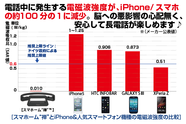 【スマホーム"禅"】 (http://www.sma-home.com/)を介して通話することにより、脳に吸収される電磁波の強度を100分の1以下に落とすことができます。