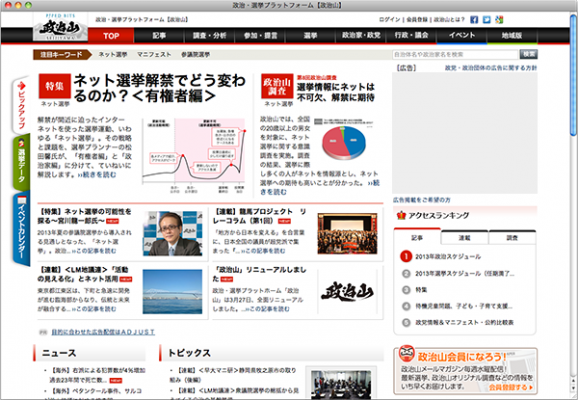 政治・選挙プラットフォーム「政治山」を運営する株式会社パイプドビッツ(本社:東京都港区 代表取締役社長CEO:佐谷宣昭 証券コード3831、以下「パイプドビッツ」)は、2013年3月27日にサイトを全面的にリニューアルいたしました。全国の政治・選挙関連イベントを集約した「イベントカレンダー」サービスを開始したほか、地域ごとに情報やトピックを分け「政治山地域版」として再構成し、さらに、メニュー再編成やデザイン刷新など、一層の内容の充実を実現しましたので、お知らせいたします。