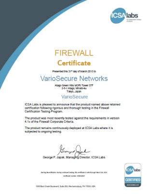 1stホールディングスグループのバリオセキュア株式会社(本社:東京都渋谷区、代表取締役社長: 稲見 吉彦、以下バリオセキュア)は、世界最大規模のセキュリティ機器の評価機関であるICSA Labsにより認定を取得しているVSR-VarioSecure Routerが、Ver.4.1 Firewall Corporate認定の更新テストをクリアし、認定の継続が承認されたことを発表いたします。