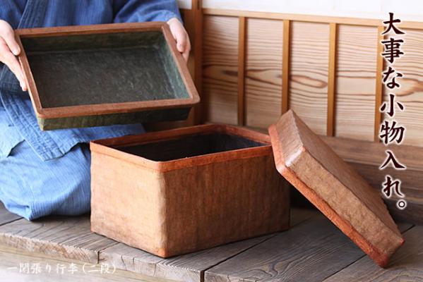 竹素地に土佐和紙、柿渋仕上げ一閑張り行李(二段)