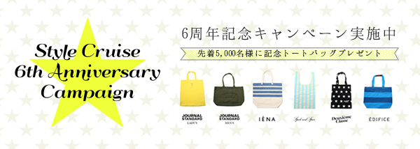 株式会社ベイクルーズ(東京都渋谷区、代表:窪田祐)は、ファッション通販サイト「 Style Cruise|スタイルクルーズ」にて、2013年4月1日(月)より、お客様への感謝の気持ちを込めて、6周年キャンペーンを開催します。キャンペーン期間中、スタイルクルーズでお買い物いただいた先着5,000名様に、JOURNAL STANDARD、IENA、EDIFICE、Spick and Span、Deuxieme Classeのオリジナルトートバッグをプレゼント。さらに、店頭でお買い上げいただいた方にも、スタイルクルーズで使える、最大10,000円のクーポンが当たるスクラッチカードをプレゼントします。