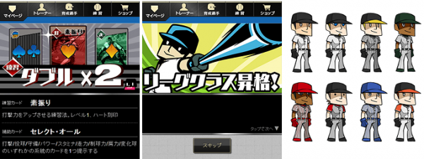 ゲームシステムには、累計300万人超が遊ぶモブキャストのソーシャルゲームと同型のシステムを採用しております。そのため、育成期間(1シーズン)は1週間となっており、月曜日から土曜日までに行わるリーグ戦と日々の練習を通じて、育成選手の能力は上昇します。育成期間は最大でも2シーズン限りとなっており、限られた時間でいかに上手に選手の能力を向上させていくか、という戦略性が問われるゲームとなっております。