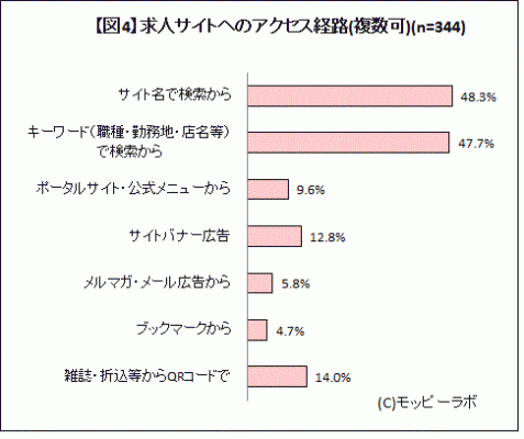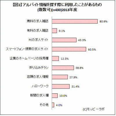 全国の15~39歳の男女に対して、「アルバイト求人サイト」についてスマートフォンで聞いたところ、過去1年間以内にアルバイトを探した経験のある430人に対し、「アルバイト情報を探す際に利用したことがあるもの」について複数回答で質問をしたところ、1位「無料の求人雑誌」(80.9%)、2位「スマートフォン・携帯の求人サイト」(60.5%)、3位「PCの求人サイト」(43.3%)という結果となった。2011年5月実施の同調査と比較すると、無料の求人雑誌:9.6ポイントアップ、携帯の求人サイト:9.6ポイントアップ、PCの求人サイト:18.6ポイントアップし、当時の3位「折り込みチラシ」と4位「PCの求人サイト」に関して今回の調査で順位が逆転した。