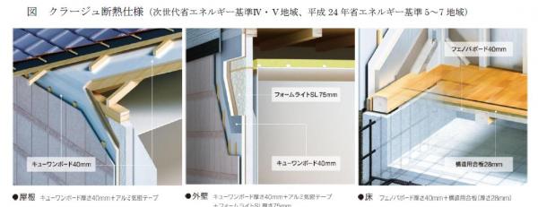 当社の主力商品である『クラージュ』は、アルミ箔面材付き高性能断熱材「キューワンボード」で柱や間柱、屋根垂木の外側から建物全体をすっぽりと包みこむ、外張断熱工法を採用しております。4月より販売する『クラージュ』はこれまでの外張断熱にプラスして、壁面に発泡ウレタンフォーム「フォームライトSL」を付加して断熱いたします。