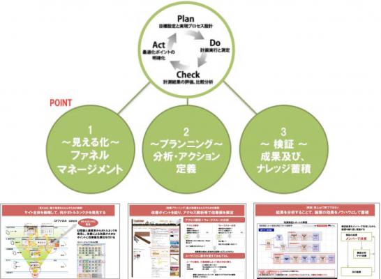 具体的な「成果」を共通のゴールとし、継続的にPDCAサイクルを回す支援を実施いたします。専任コンサルタントチームが、可視化・分析・施策の順位付けを行い、改善定義とともにPDCAサイクルを総合的に支援いたします。