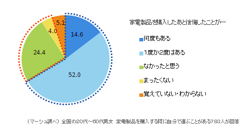 しかしその一方で、『家電製品を購入したあと、何らかの理由で後悔したことはありますか』との質問に対しては、66.5%の人が「ある」という回答でした(「何度もある」14.6%、「1度か2度はある」52.0%の合計)。
