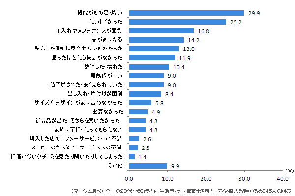後悔した経験を持つ人に、今回のアンケートでは掃除機・洗濯機といった生活家電と、エアコン・扇風機・こたつといった季節家電に絞り、後悔した家電の種類、その商品に対する評価、後悔した理由、その後の対処・解決方法を聞きました。