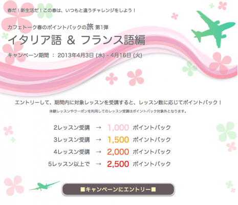 第1弾は、第2外国語として人気の、イタリア語とフランス語レッスンのポイントバックキャンペーンです。