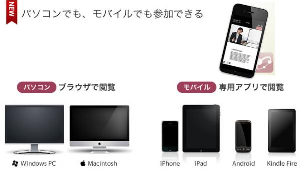 これまでのGigaCastは、パソコン(Windows,MacOS)でのみ視聴可能でしたが、新バージョンでは、それに加え、各種スマートフォン・タブレットでも視聴できるようになりました。 スマートフォンやタブレットしか所有していない学生や、外出や出張の多い営業職の人たちにもライブセミナーを閲覧いただけるようになり、オンラインLIVEセミナーの適用範囲が更に広がります。