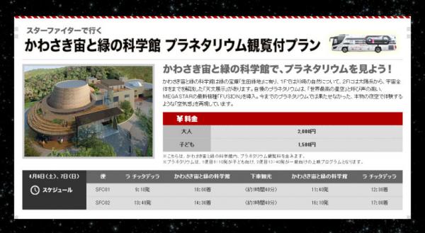 ・SFC02便行程:ラ チッタデッラ出発(13:40)⇒かわさき宙と緑の科学館到着(14:30)⇒下車観光(約1時間40分)⇒かわさき宙と緑の科学館出発(16:10)⇒ラ チッタデッラ到着(17:00) ※プラネタリウムは一般向けプログラムとなります。