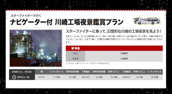 その他にも、近年ブームとなっている工場夜景観賞において人気の高い川崎工場エリアへ夜景ナビゲーターによる解説付きで楽しめる川崎工場夜景観賞プランも提供し、川崎市内の近未来スポットの魅力をアピールします。