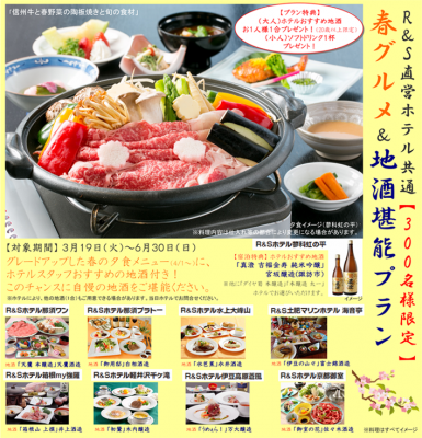 < 会員向け「R&Sホテル」共通企画 > 『春グルメ&地酒堪能プラン』 10施設で開催! ~グレードアップした春の夕食メニューに、スタッフおすすめ各地の地酒付き