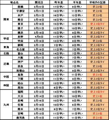 今年のさくらは、各地で記録的に早い開花となり、東京や鳥取、九州各地では観測史上1位の早い記録となりました。満開日につきましても、九州各地や、横浜、銚子、和歌山、鳥取などで、史上1位の早さになりました。