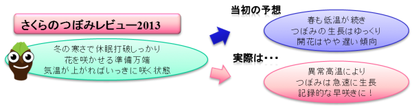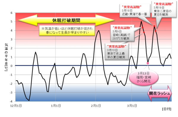 冬の寒さで休眠打破がしっかり行われていたさくらのつぼみは、3月の記録的な高温の影響で急速に生長。東日本・西日本のさくらは、稀にみる早さで開花しました。