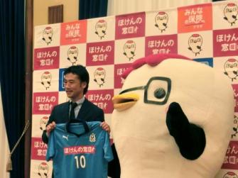 「ほけんの窓口」をはじめとする来店型保険ショップを、全国に約390店舗展開しているほけんの窓口グループ株式会社(本社:東京都渋谷区 代表取締役社長:今野則夫)は、2013 年5月23日(木)に開催される元サッカー日本代表 藤田俊哉氏(ジュビロ磐田アドバイザー)の引退送別試合を冠協賛することを決定し、4月8日(月)に主管のヤマハフットボールクラブによる発表記者会見が開催されました。