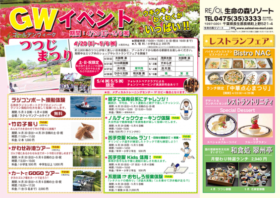 今年のゴールデンウィークもどうぞ、ご家族の皆様やお友達・お仲間とごいっしょに生命の森リゾートの多彩なイベントをお楽しみください。