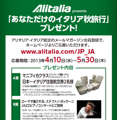アリタリア-イタリア航空のホームページよりご応募いただけます。