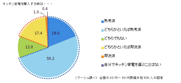 前回の「生活家電・季節家電編」と同様、まず始めに、キッチン家電を購入する際に、じっくり検討してから購入する「熟考派」か、あまり迷わずに決める「即決派」、自分がどちらにあてはまると思うかをたずね、購入したいキッチン家電製品を選ぶ際の訪問店舗数を尋ねました。
