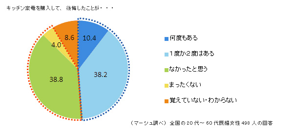 前回の調査と同じく“熟考派”と答えた人が約7割、お店を2軒以上見に行くという人も7割、という結果になりましたが、キッチン家電を購入してから何らかの理由で後悔したことのある人は48.6%おり、約半数となりました。
