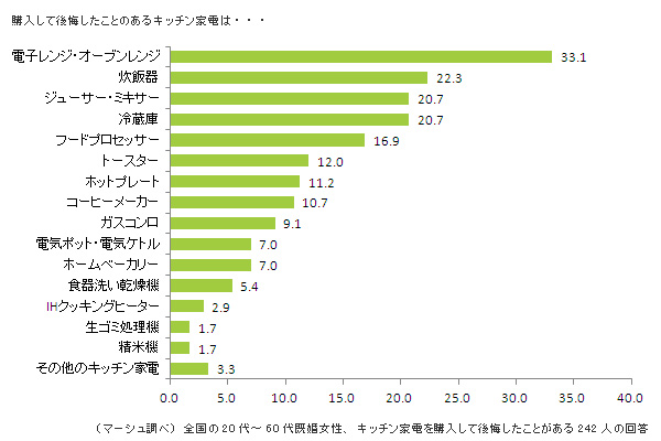 後悔したキッチン家電の種類として最も多かったのは、「電子レンジ・オーブンレンジ」。後悔したことが「ある」と回答した242人の女性中、約2人に1人という割合でした。