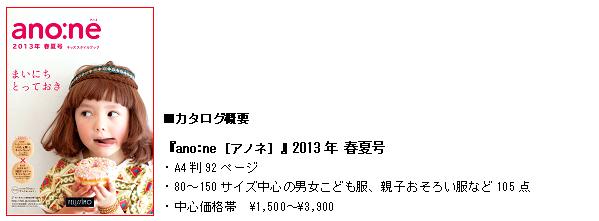 株式会社フェリシモは、こども服カタログ『ano:ne(アノネ)』の2013年春夏コレクションの販売を、ウェブサイトにて4月中旬よりスタートしました。きょうだいや親子のおそろい服、夏に大活躍のTシャツなど、オリジナルアイテム計105点を提案いたします。通園通学はもちろん、家族でのお出かけにも使える、フォトジェニックなコレクションをとりそろえました。http://feli.jp/s/anone/