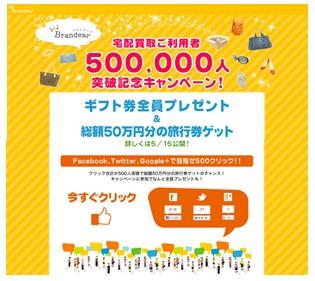 ブランディアでは、累計利用者数50万人突破を記念して、ギフト券全員プレゼント&総額50万円分の旅行券の当たるキャンペーンの実施を予定しております。