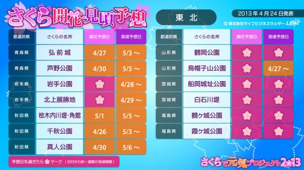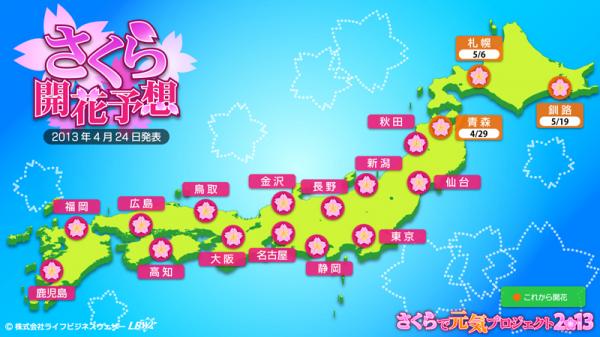 引き続き、さくらで元気プロジェクト2013に賛同して頂ける各種メディア・CP(コンテンツプロバイダー)・企業・個人開発者様を“さくらで元気パートナー”と称し、広く募集しています。さくらで元気パートナーにご登録頂くと(無料)、さくら情報のデータ(CSV形式)や画像、お天気画像を無償でご利用頂けます。ぜひ、特設サイトよりご登録下さい。【特設サイト】http://tenki.lbw.jp/sakura2013/