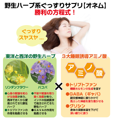 【オネム】(http://goo.gl/2SRpB)は、[野生ハーブ]と[睡眠誘導アミノ酸]の両方をぜいたくに配合した