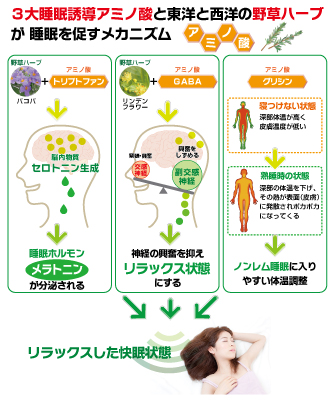 ・睡眠誘導アミノ酸[トリプトファン]:『睡眠ホルモン』である「メラトニン」の分泌を正常に促す作用があり、