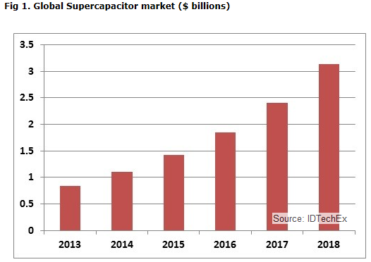 スーパーキャパシタ/ウルトラキャパシタの開発業者やメーカーは急速に増加しており、過去1、2年間で40から80へと倍増した。それぞれ何らかの事業を行っているため、Maxwellのシェアは失われつつある。多くの事業は有毒で可燃性のアセトニトリルを含むスーパーキャパシタによるが、現在メーカーの半数以上は、非可燃性で比較的無害な(ほとんど水のような)電解質に基づくデバイスを提供するようになってきた。改良された有機電解質を使うメーカーもあり、固体電解質も開発中である。これらのメーカーの多くは様々な技術を使っており、安全性の改善や性能の改良によってシェアを獲得するだろう。米国調査会社IDTechEx社の調査レポート「電気二重層キャパシタ 2013-2023年:電子機器と電子工学向けウルトラキャパシタ、電気二重層キャパシタ (EDLC)、電子化学キャパシタ、スーパーカバッテリ、非対称型キャパシタ - Electrochemical Double Layer Capacitors: Supercapacitors 2013-2023」は、以下の図のようにスーパーキャパシタの市場を予測している。