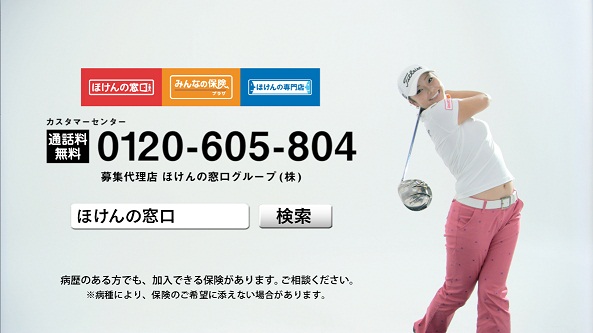 今年度からほけんの窓口グループの所属選手として活躍することになった女子プロゴルファーの三塚優子さん。プロゴルファーとして、そのシーン毎に合ったクラ ブ選びの重要さを誰よりも理解している三塚さん。クラブ選びは、“プロ”のキャディからアドバイスを受けるのが大切なように、保険選びも“プロ”のアドバ イスが欠かせないと語ります。最後は豪快なスイングとともに「三塚にも見つかる!」という決め台詞で締めています。