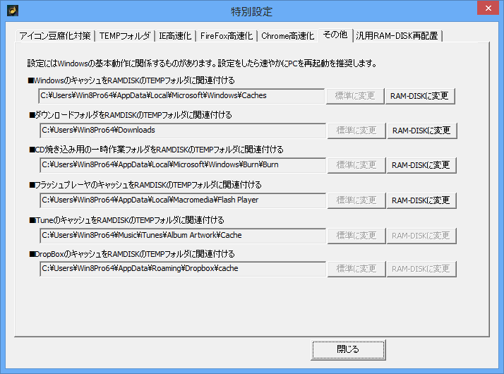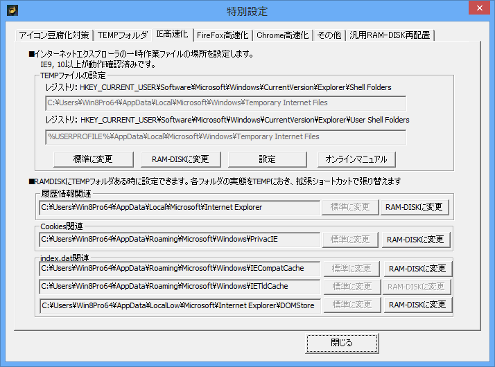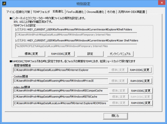 WindowsのTEMPフォルダ、IEのキャッシュ、ブラウザキャッシュをRAM-DISKにワンタッチで再配置する機能を装備。