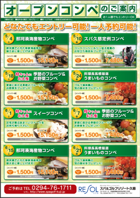 ゴルフ場やホテル・旅館の運営や福利厚生サービス事業等を通してリゾートの再生・活性化を推進するリゾートソリューション(略称:リソル)が運営する『スパ&ゴルフリゾート久慈』(茨城県常陸太田市)では、どなたでもエントリーできる(お1人様でもエントリー可能)オープンコンペをこの5月・6月も多彩に(下記参照)開催予定しています。
