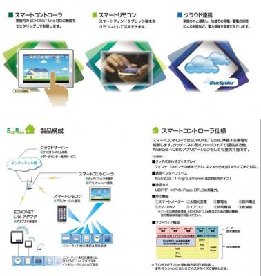 このたび提供を開始する「ENESMA Home」は、当社製タブレット型「スマートコントローラ」を利用することで、ECHONET Liteに対応するあらゆる家電メーカーの機器をつなぎます。これにより、機器のモニタリングおよびコントロールが可能となり、リアルタイムにエネルギーの流れを把握し、効率的な省エネをサポートします。なお、スマートフォンやタブレット端末にHEMSアプリケーションをインストールし、スマートリモコンとして利用することもできます。さらに今後は、当社のクラウドサービス「BlueSpider」と連携し、外出先から自宅の家電を操作することも可能になります。