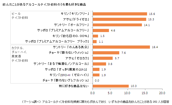 頻度に関わらずアルコールテイスト飲料を飲む人で、提示した銘柄のいずれかを飲んだことがある262人に最も好きな商品を回答してもらったところ、ノンアルコールビールをわずかに上回り、「のんある気分」(16.4%)がトップでした。上位4つはいずれも僅差で、「キリンフリー」(15.6%)、「ドライゼロ」(15.3%)、「オールフリー」(14.1%)となっています。